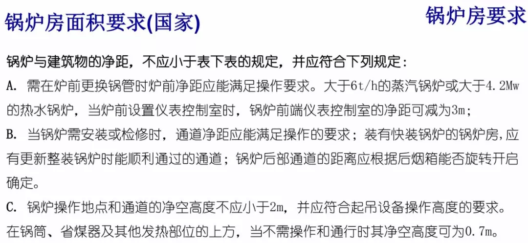 SHX 循環(huán)流化床蒸汽鍋爐熱水鍋爐改造的基本注意事項不外乎,鍋爐房安裝空間、鍋爐房電氣連接、鍋爐房燃氣系統(tǒng)、鍋爐房新風(fēng)系統(tǒng)、鍋爐房煙氣系統(tǒng)幾部分。針對鍋爐房的空間要求在和鍋爐的廠家確認鍋爐的檢修空間和安全通道。這里需要注意鍋爐的控制系統(tǒng)的安裝位置,要放置在較為便于操作的位置。同時鍋爐房面積也有一定的要求: